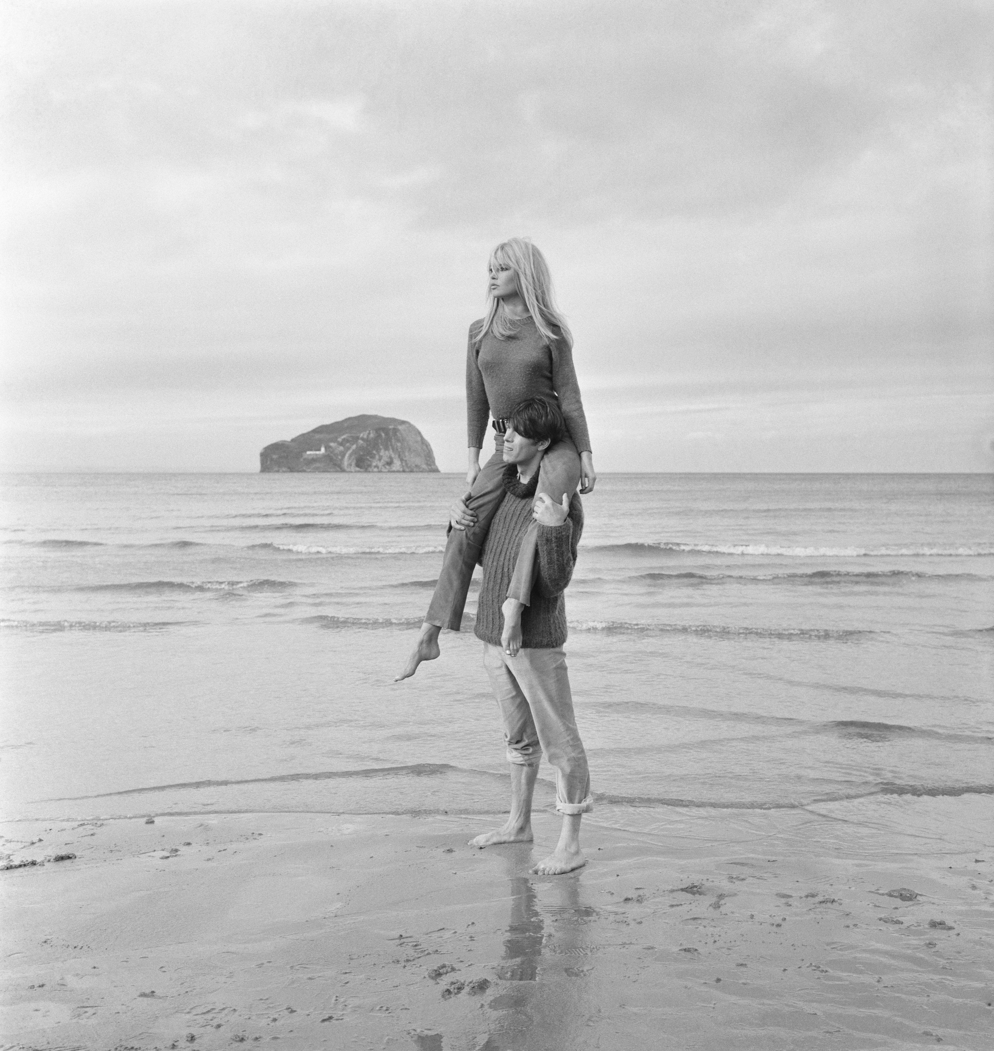August 1966: French actor Laurent Terzieff giving Brigitte Bardot a piggy-back ride on the windy beach at North Berwick, Scotland, in a scene from the film 'Two Weeks in September', directed by Serge Bourguignon. (Photo by Jim Gray/Keystone Features/Getty Images)