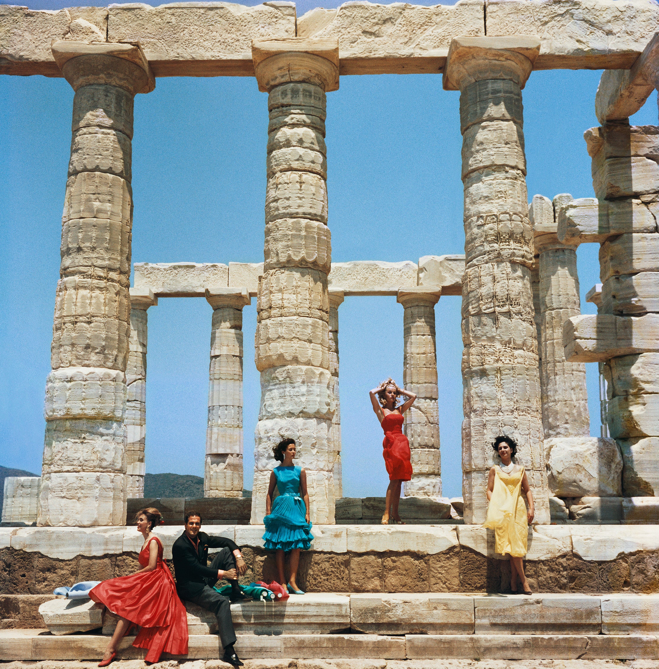 Dimitris Kritsas, a fashionable young couturier, poses among the gleaming Doric columns of the temple to Poseidon at Sounion, 1961. (Photo by Slim Aarons/Getty Images)