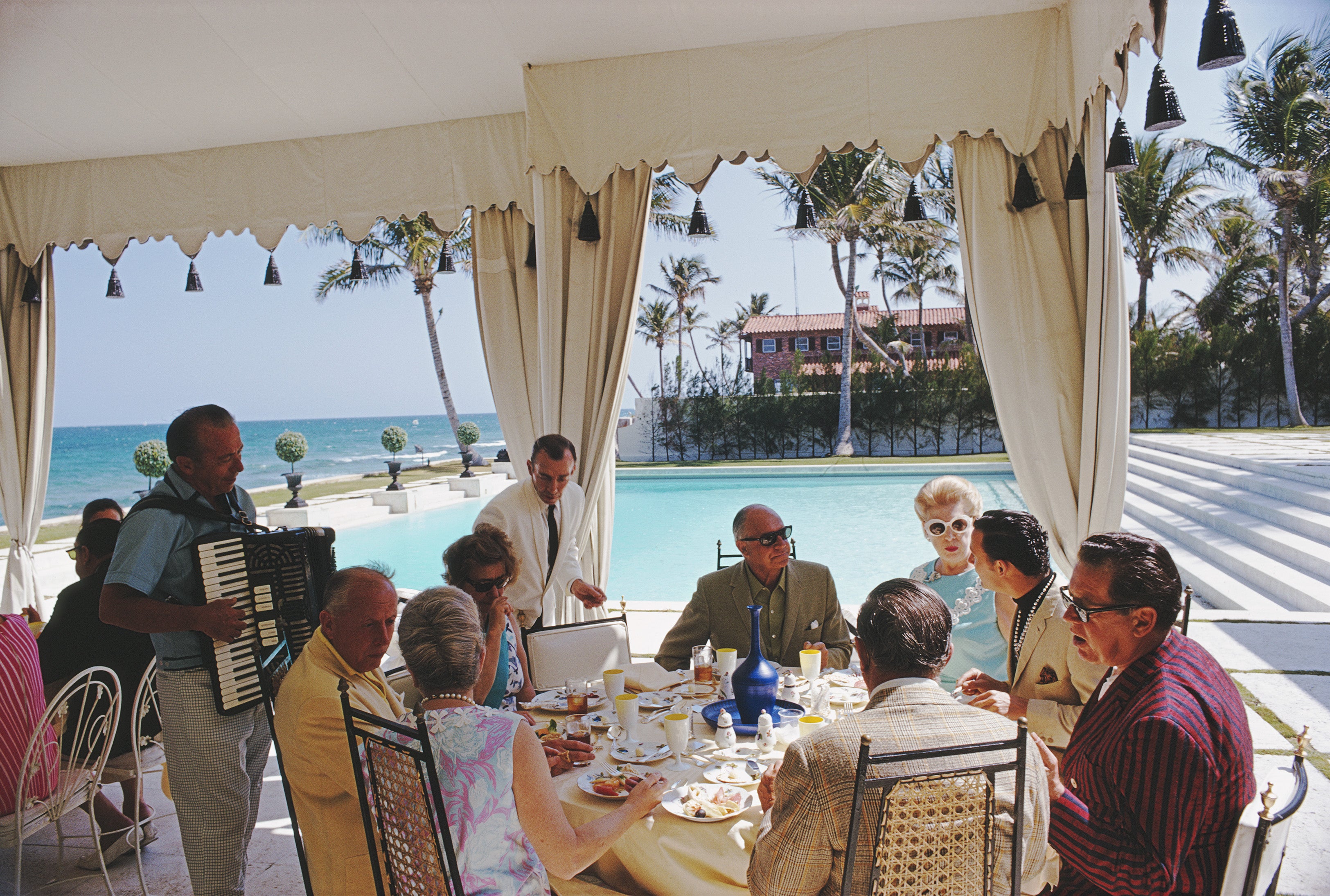 Accordion music accompanies a meal by the pool at the home of Molly Wilmot in Palm Beach, Florida, April 1968. (Photo by Slim Aarons/Hulton Archive/Getty Images)