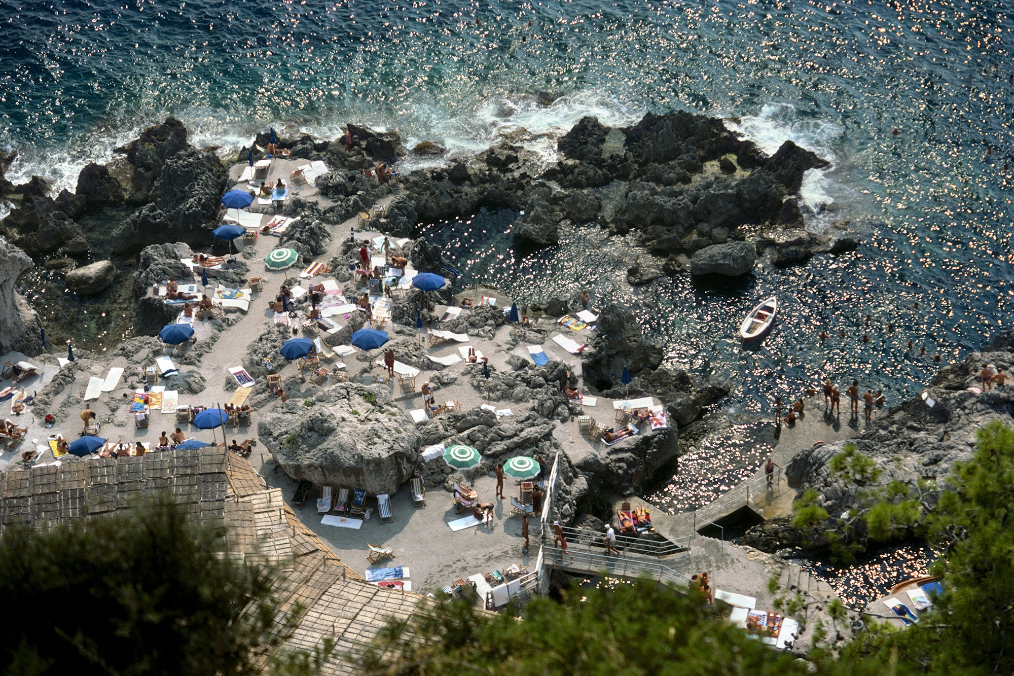 Aerial view of sunbathers and parasols at La Fonteline beach, at the base of the Faraglioni rocks on the island of Capri, Italy, in September 1989. (Photo by Slim Aarons/Getty Images)