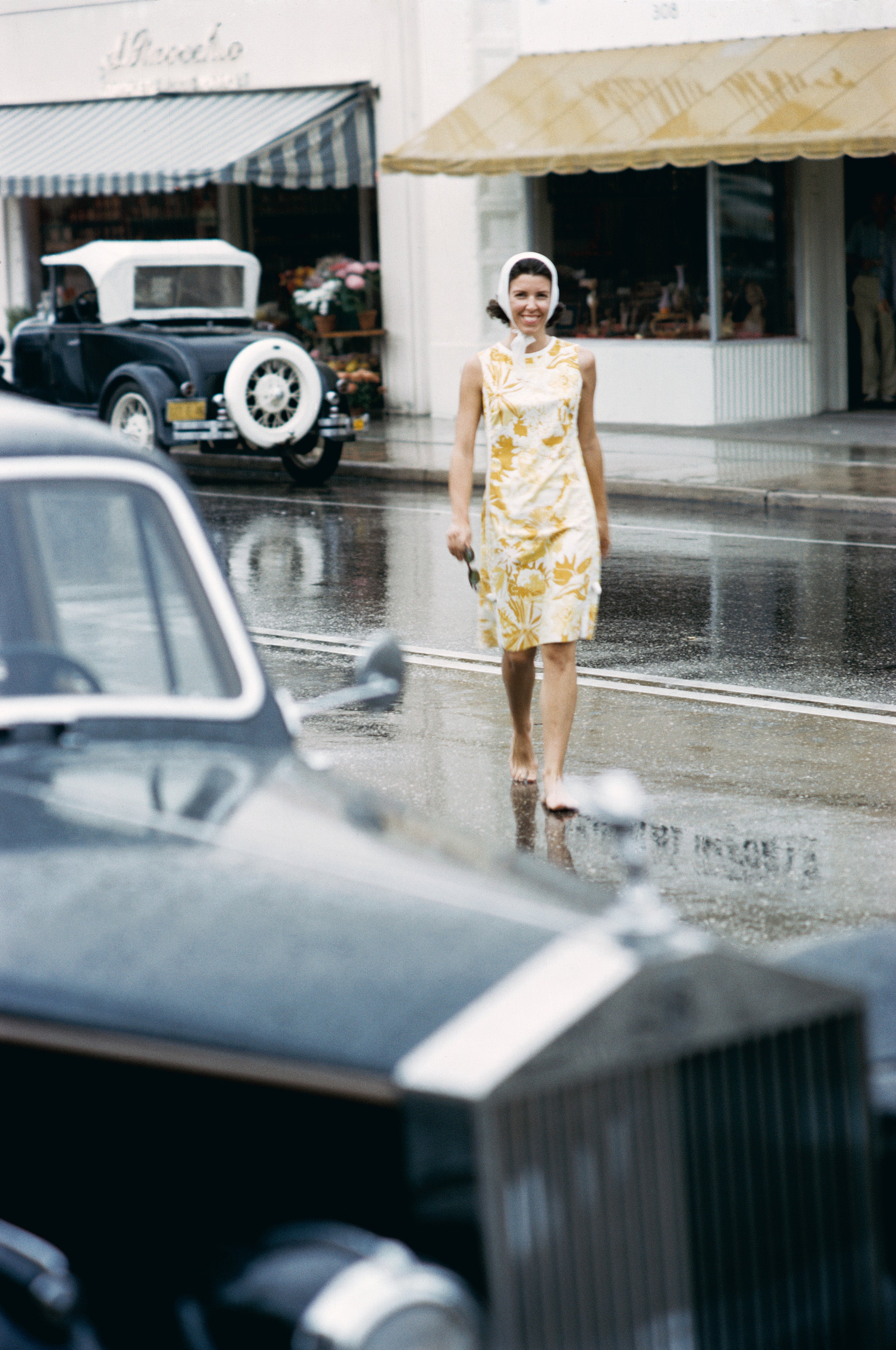 Mrs A Atwater Kent Jnr dressed in a simple shift dress is crossing the road barefoot in the rain, 1964. A Wonderful Time - Slim Aarons (Photo by Slim Aarons/Getty Images)