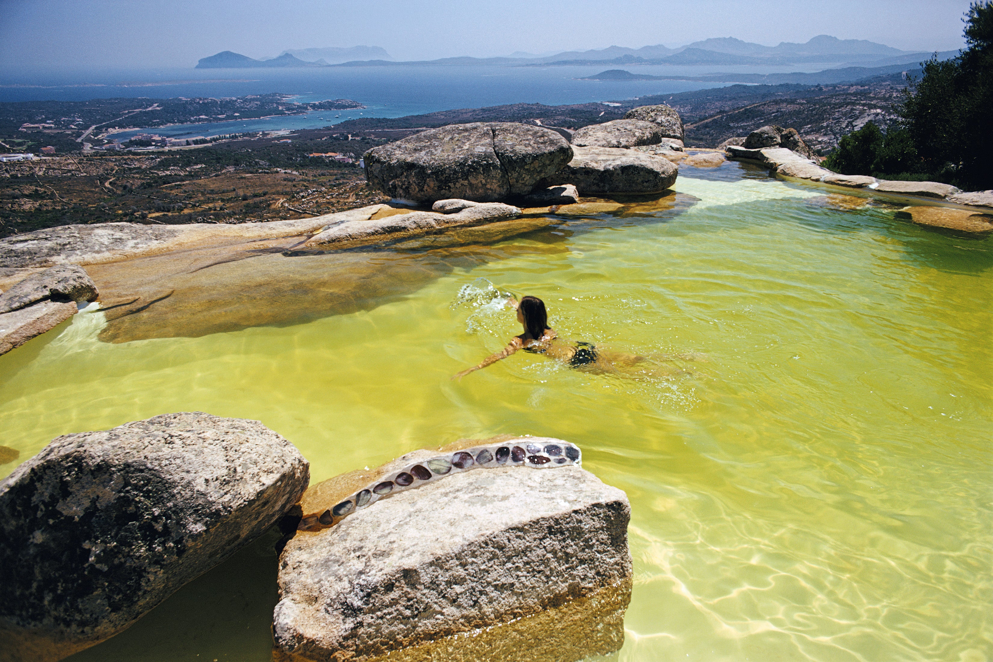 A swimmer in the seaside-style pool at architect Jacques Couëlle's home 'Monte Mano', on the Costa Smeralda, Sardinia, Italy, August 1973. (Photo by Slim Aarons/Hulton Archive/Getty Images)