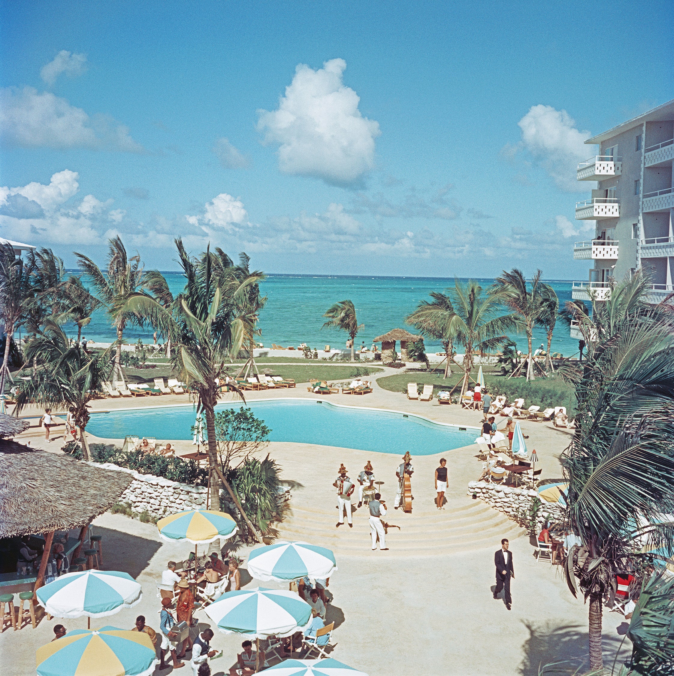 The outdoor swimming pool at Nassau Beach Hotel, Nassau, Bahamas, 1959. The hotel was the first to built by Howard Johnson outside the United States. (Photo by Slim Aarons/Hulton Archive/Getty Images)