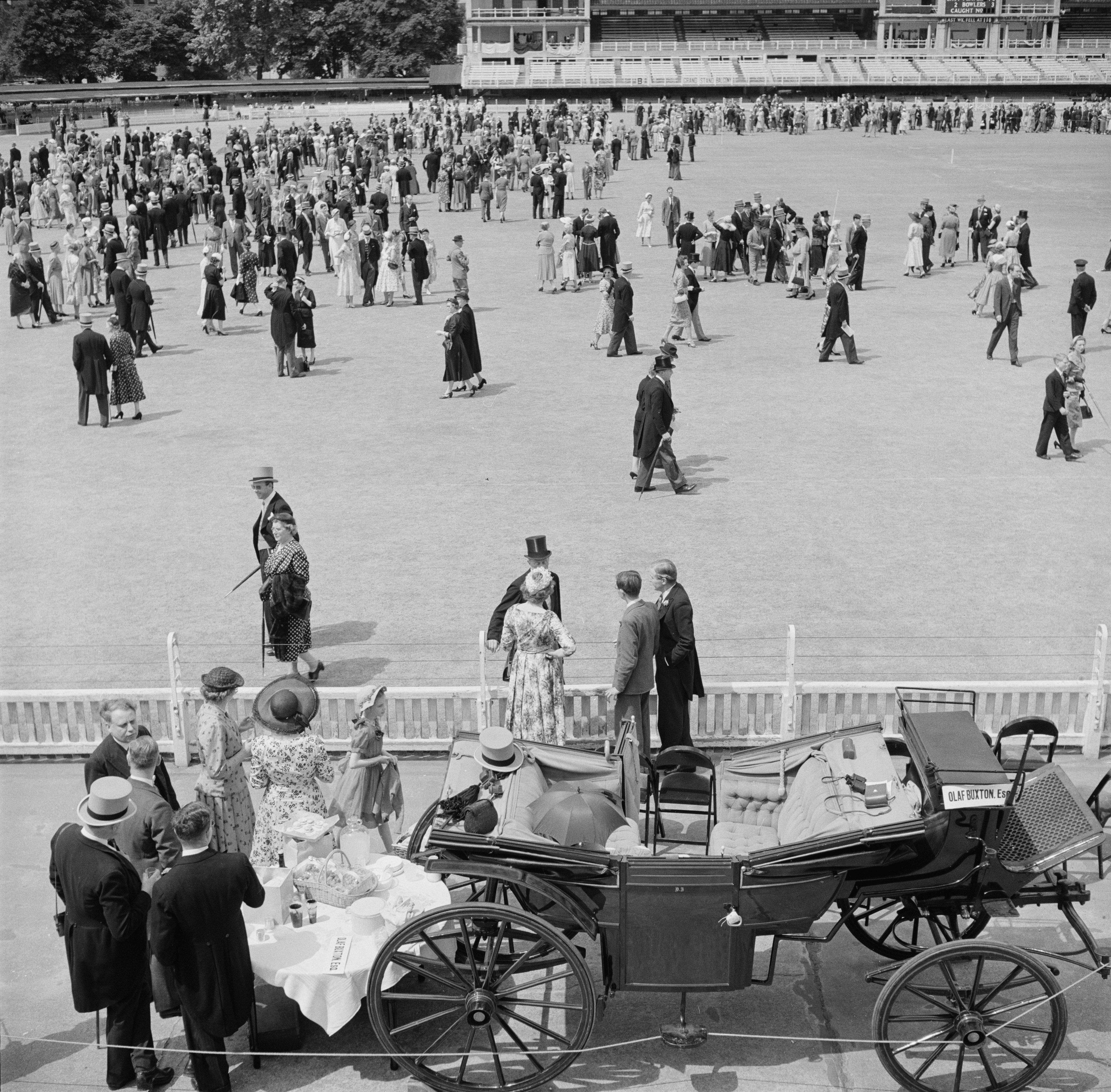 A view of spectators on the pitch at a cricket match between the public schools of Eton and Harrow at Lord's Cricket Ground, London, 1955. (Photo by Slim Aarons/Hulton Archive/Getty Images)