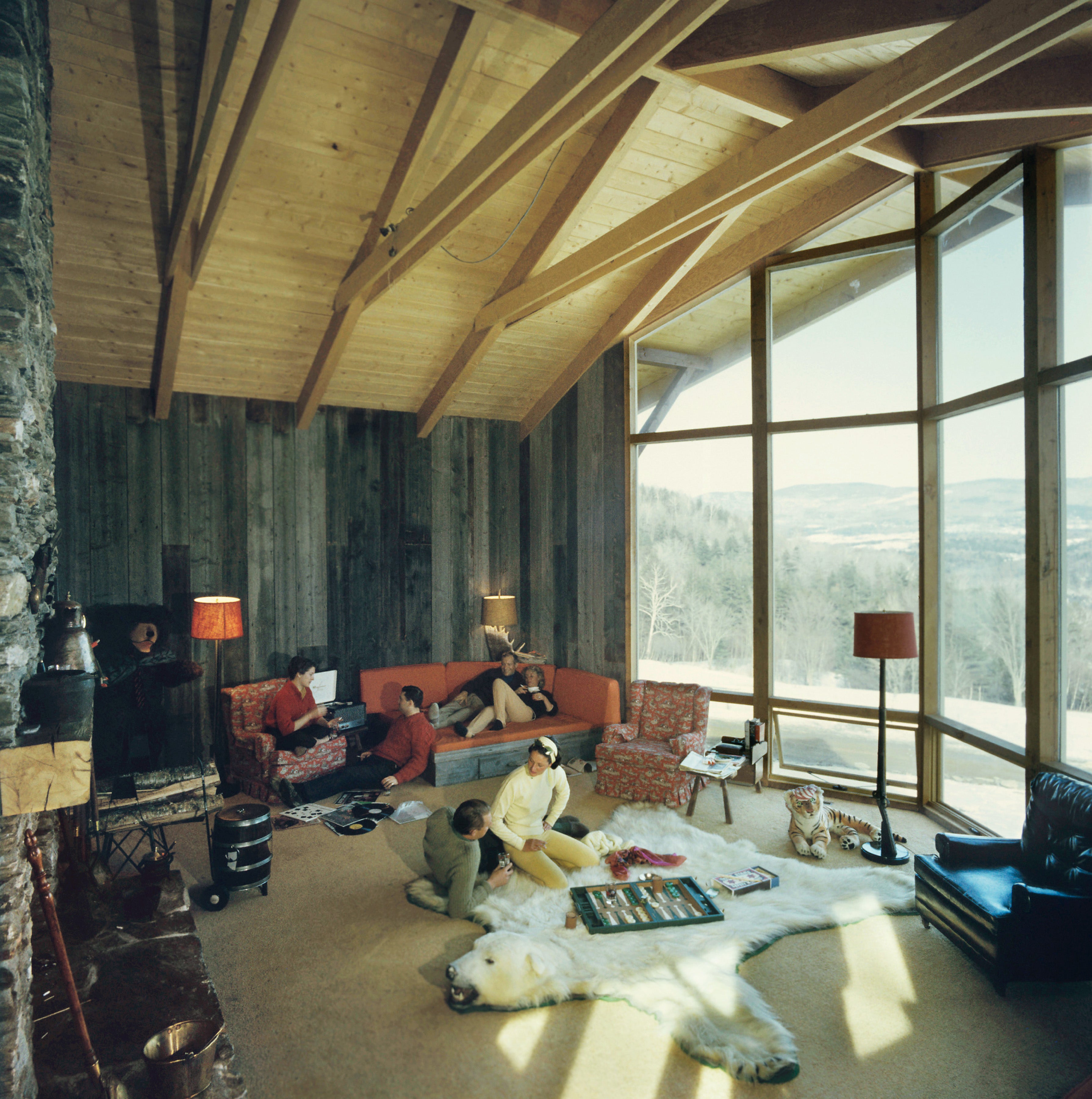 Stockbroker A Albert Sack Jr playing backgammon with Betsy Pickering on a polar bear rug at his chalet at the Sugarbush Mountain ski resort in in Warren, Vermont, December 1960. (Photo by Slim Aarons/Getty Images)