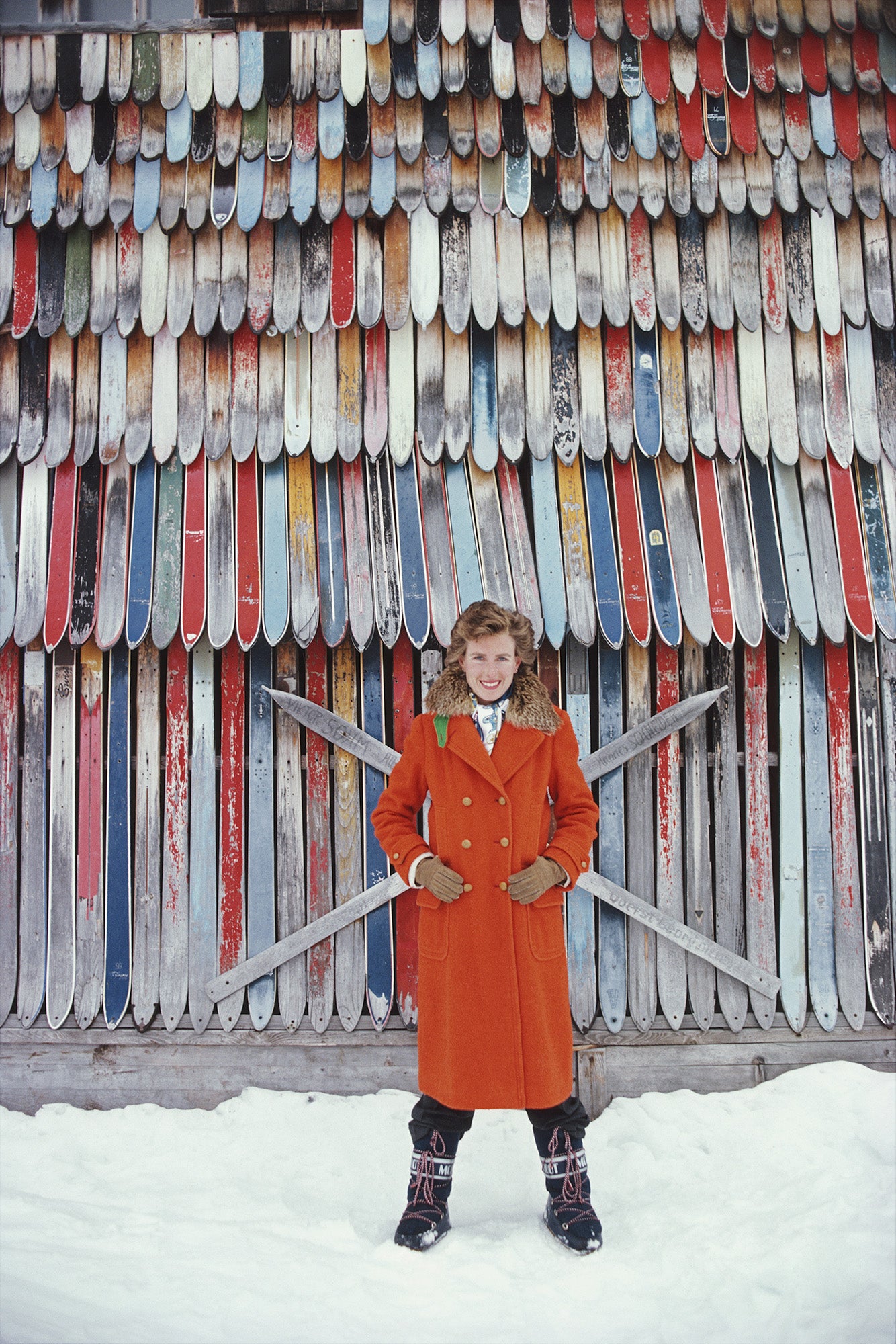 Princess Lucy Ruspoli stands in front of a colourful wall of old skis in Lech am Arlberg, Austria, February 1979. (Photo by Slim Aarons/Hulton Archive/Getty Images)