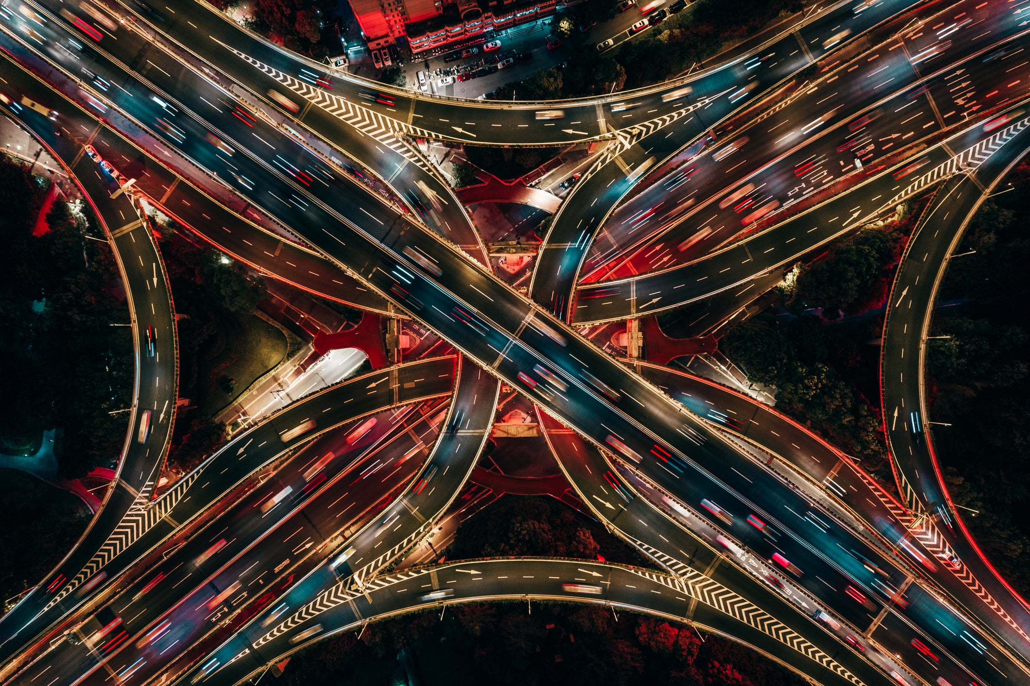 Top view of overpass and road intersection at night, Shanghai, China, 2021.