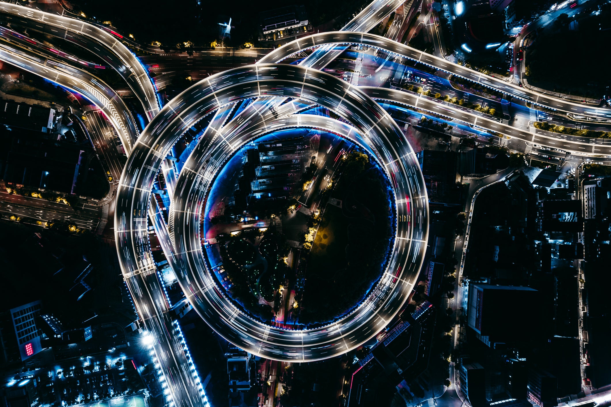 Top view of overpass and road intersection at night, Shanghai, China, 2021.