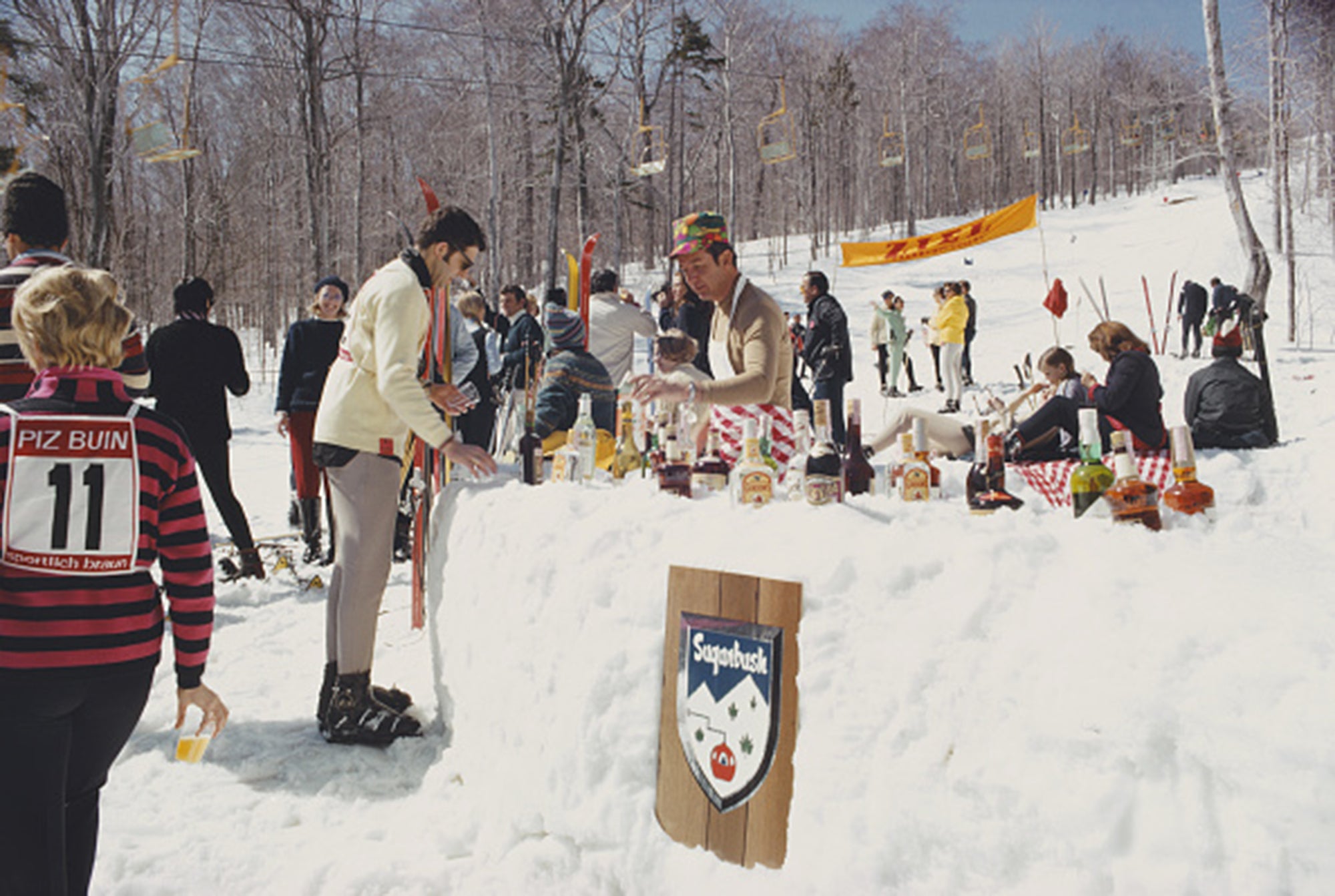 An outdoor bar at Sugarbush, a mountain resort in Vermont, March 1969. (Photo by Slim Aarons/Hulton Archive/Getty Images)