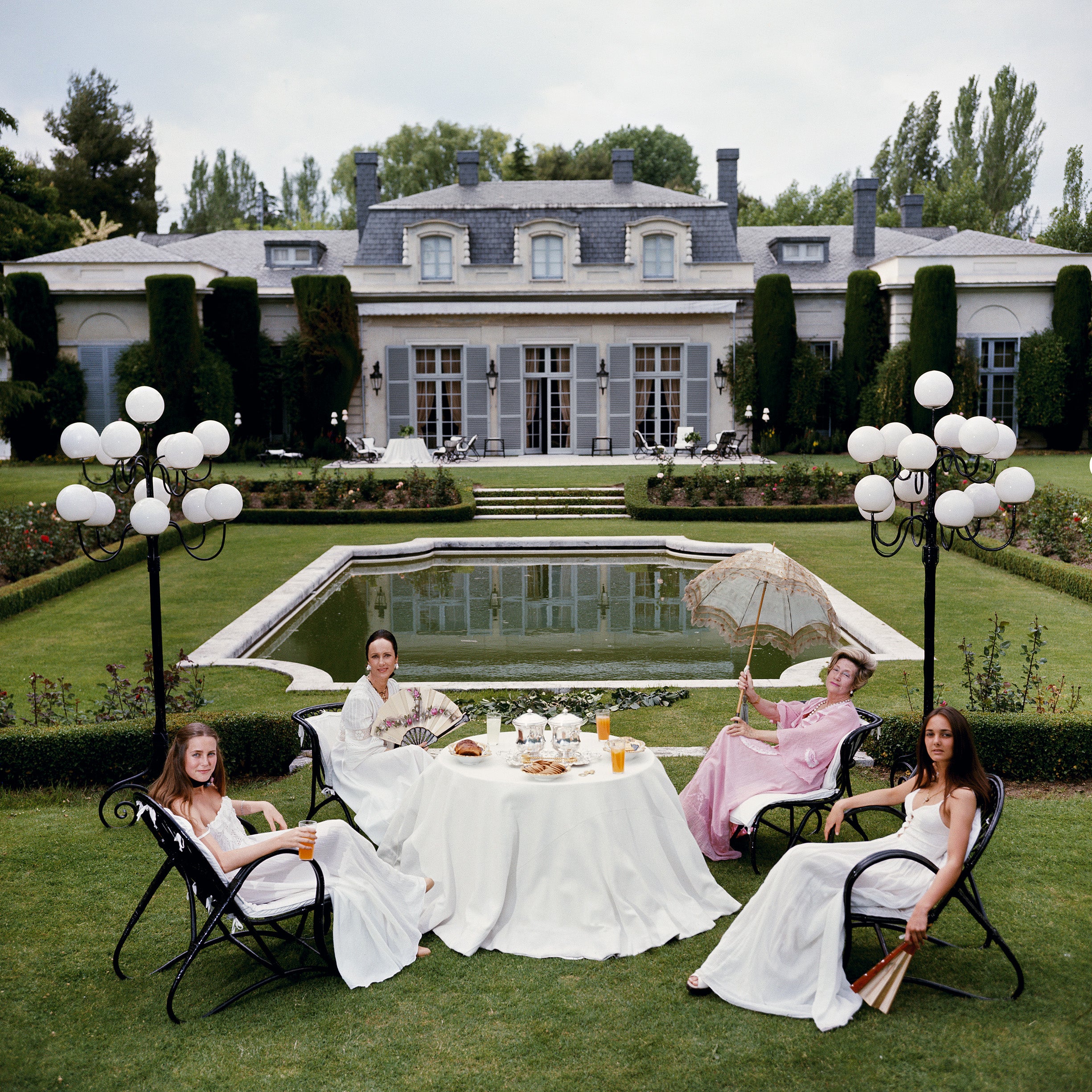 Dowager Countess of Romanones, Blanca de Borbon (right, with Parasol), with her daughter, the Marquesa of Tamarit (left, with fan) and granddaughters, Maria (left) and her younger sister, Victoria, at the Countess's home in Madrid, Spain, May 1976. (Photo by Slim Aarons/Getty Images)