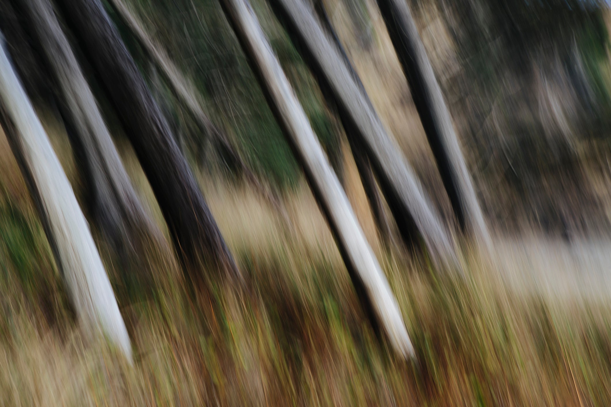 Tree trunks, white straight and smooth leaning at an angle, Arcadia Beach State Park, Oregon, 2018.