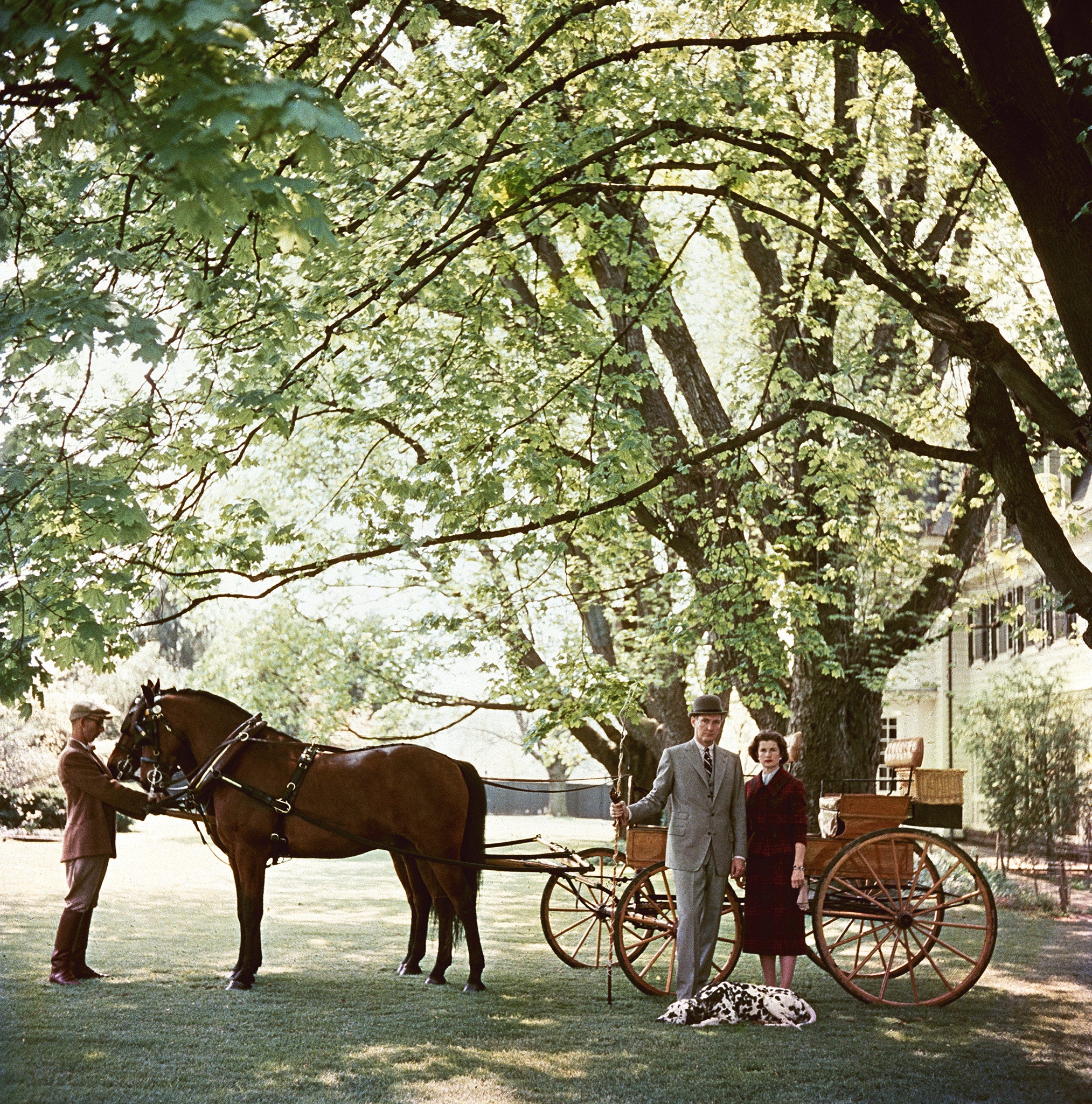 A Dalmatian dog lies at the feet of Mr and Mrs John M Seabrook as they pose with a pony and trap in the garden of their home, the Seabrook estate, New Jersey, 1958. A Wonderful Time - Slim Aarons (Photo by Slim Aarons/Getty Images)